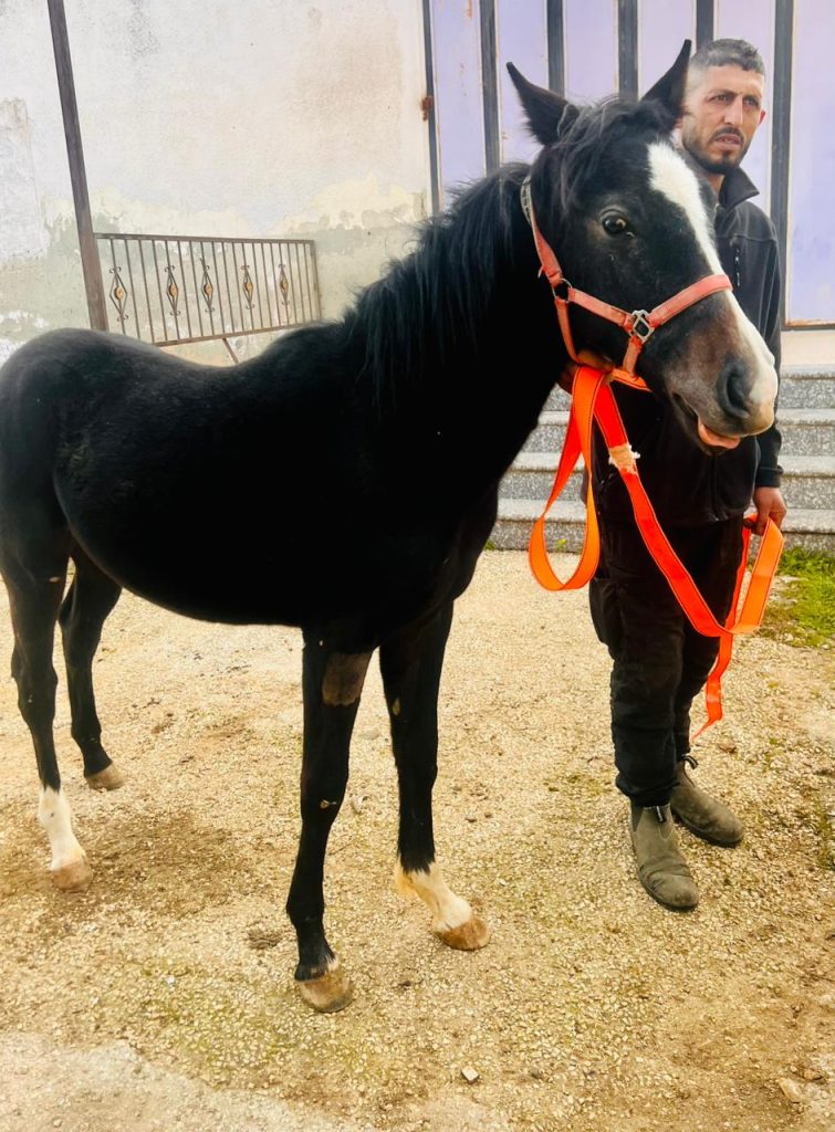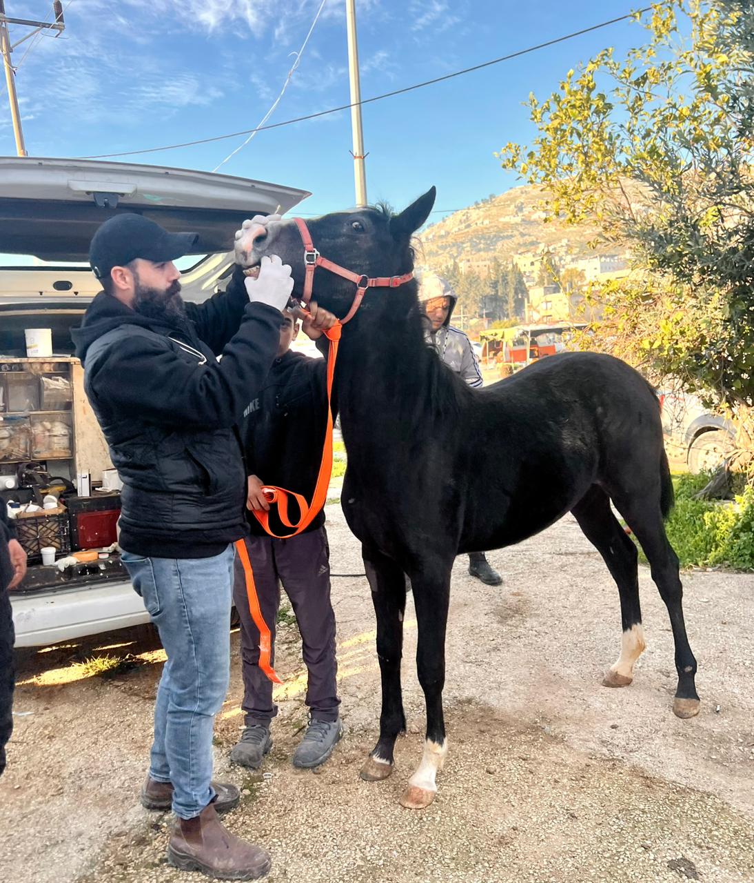 At the busy Nablus animal market, Dr Rakan spotted a young horse he had treated just weeks earlier. When she first arrived, she had a long, deep wound on her foreleg – around 13 centimetres in length – caused by a sharp piece of metal.
