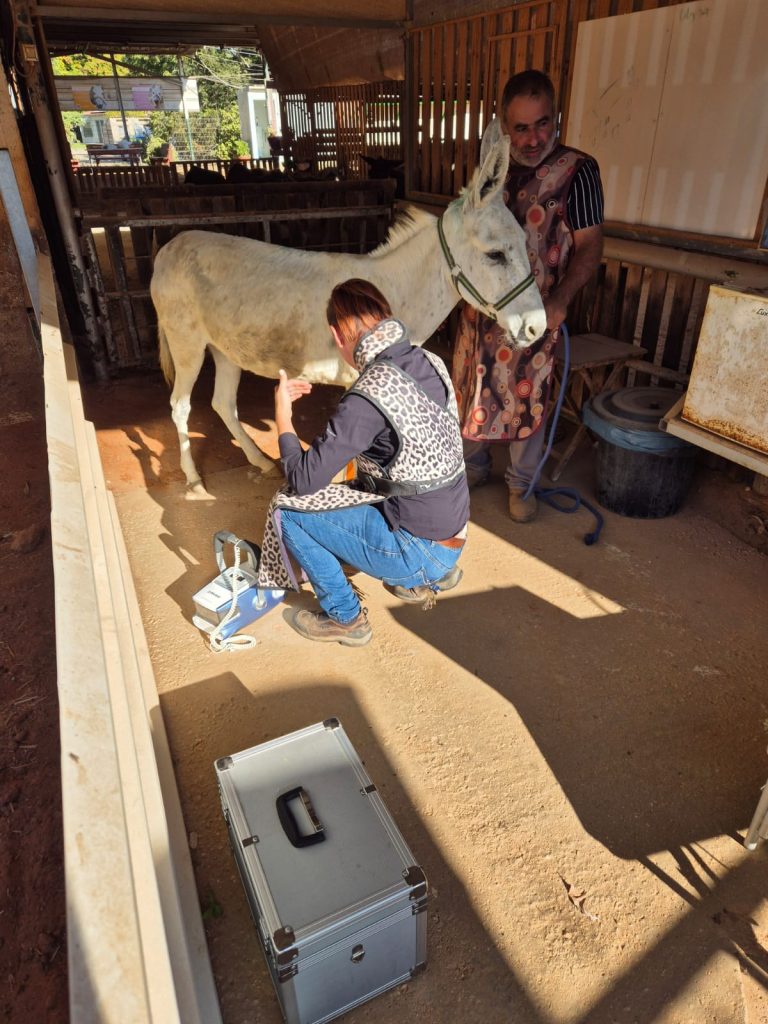 Our vet wanted to x-ray the white donkey’s fetlock and discovered arthritis in her fetlock joint – likely the cause of her earlier lameness. We’re pleased to say our team are managing her condition with ongoing care and pain relief, ensuring she stays as comfortable as possible.