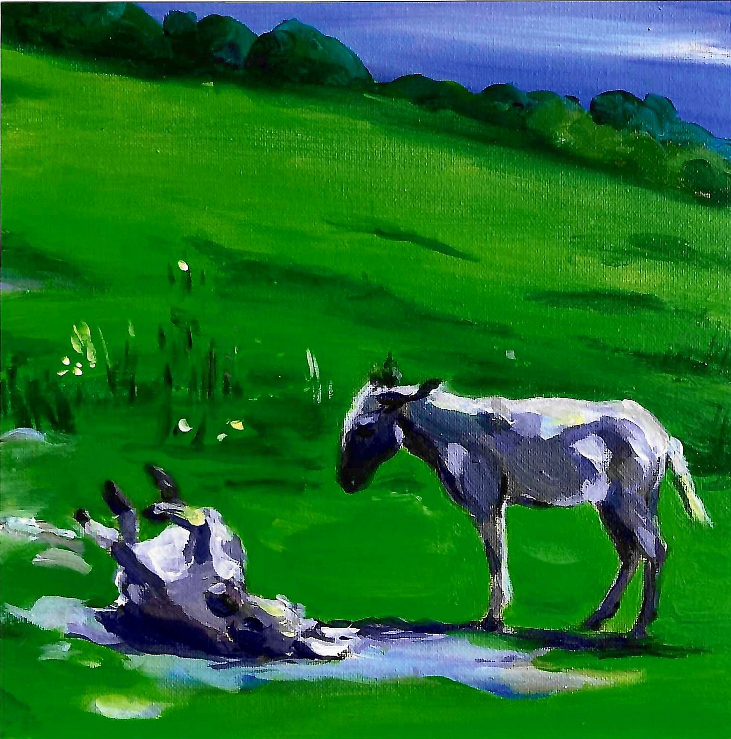 Handmade and hand signed limited edition greetings card.  Features a beautiful design of two donkeys in a field.
